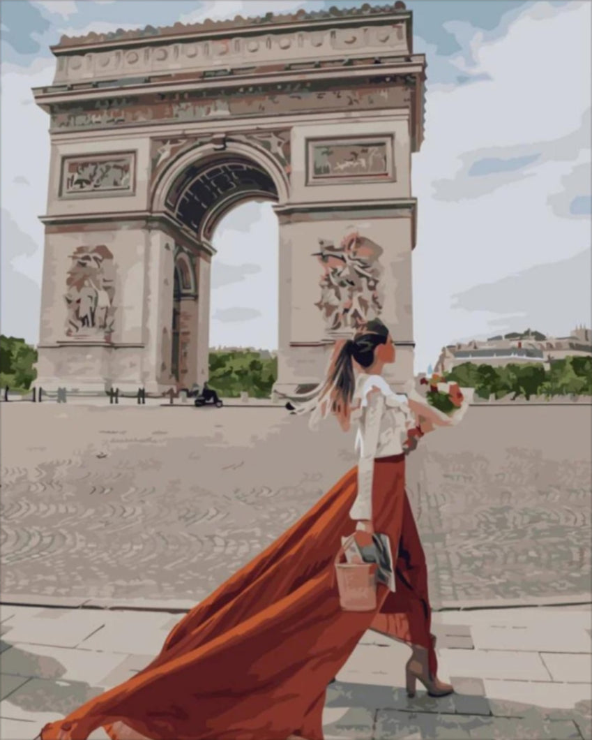 Fedezze fel a Úton - számfestő készlet páratlan szépségét, amely egy gyönyörű hölgyet ábrázol, amint sétál a híres Diadalív alatt. Az elegáns, piros szoknyás figura kezében friss virágokkal, és a lágy szellőben lengedező hajjal varázslatos, szinte mesebeli hatást kelt. A háttérben a francia főváros ikonikus épületei sejlenek fel, mindez egy napfényes, derült égi látképpel párosul, amely felerősíti a festmény hangulatát.
