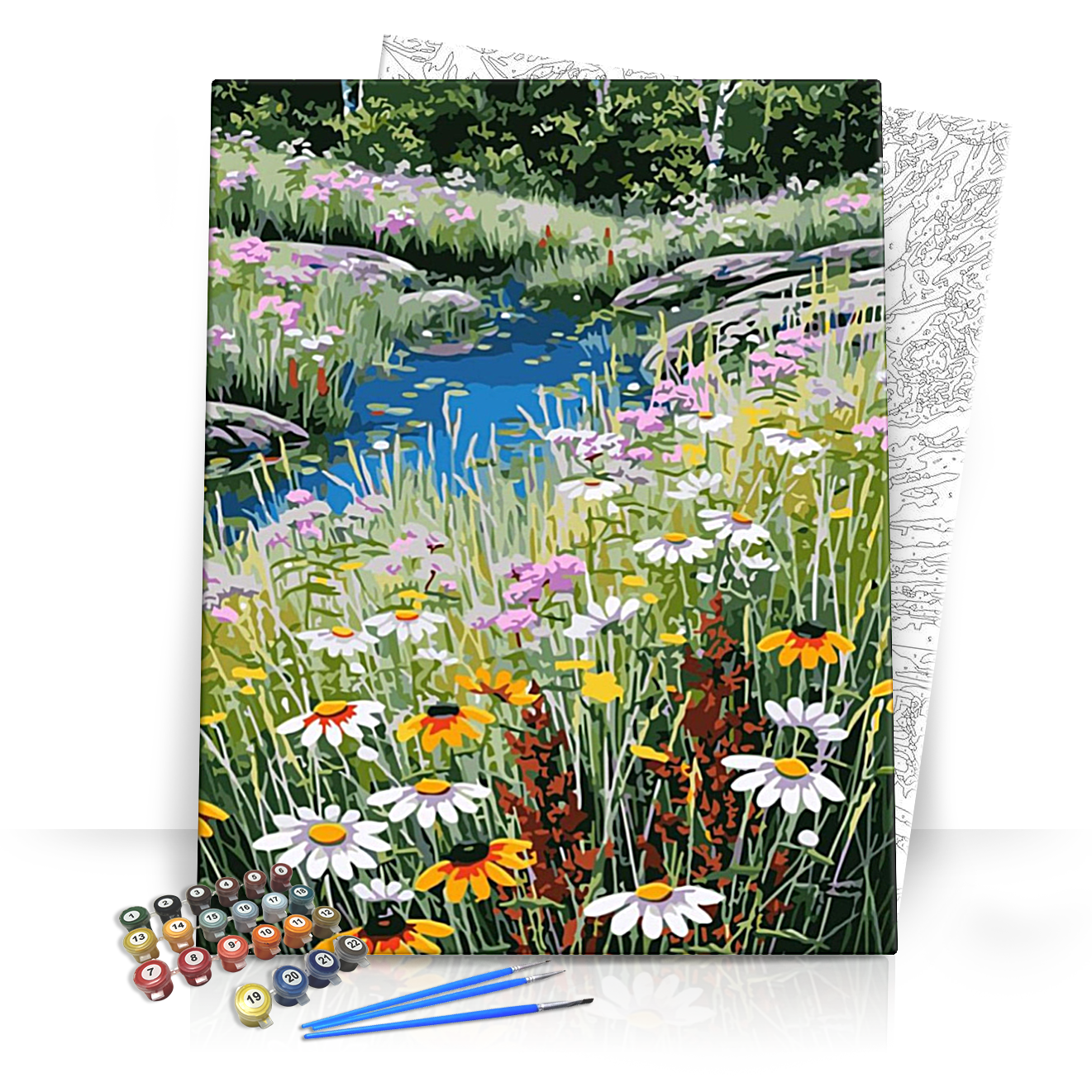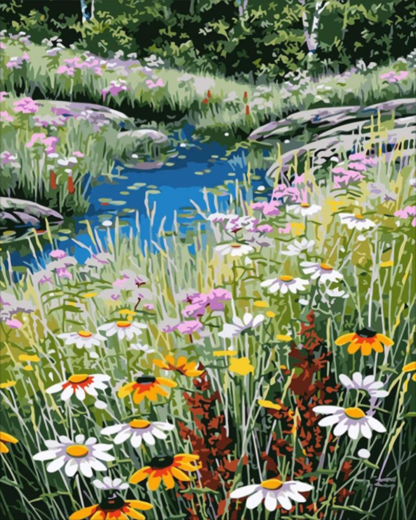 A kép fantasztikus színekkel játszik: a fehér margaréták, sárga virágok, valamint a zöld fű és a rózsaszín virágok harmonikus összhangba kerülnek a háttérben csillogó vízfelülettel. A természetes elemek kombinációja nyugtató, mégis inspiráló hatással bír, így nemcsak a festés során, hanem a kész mű csodálása közben is egyedi élményt nyújt.