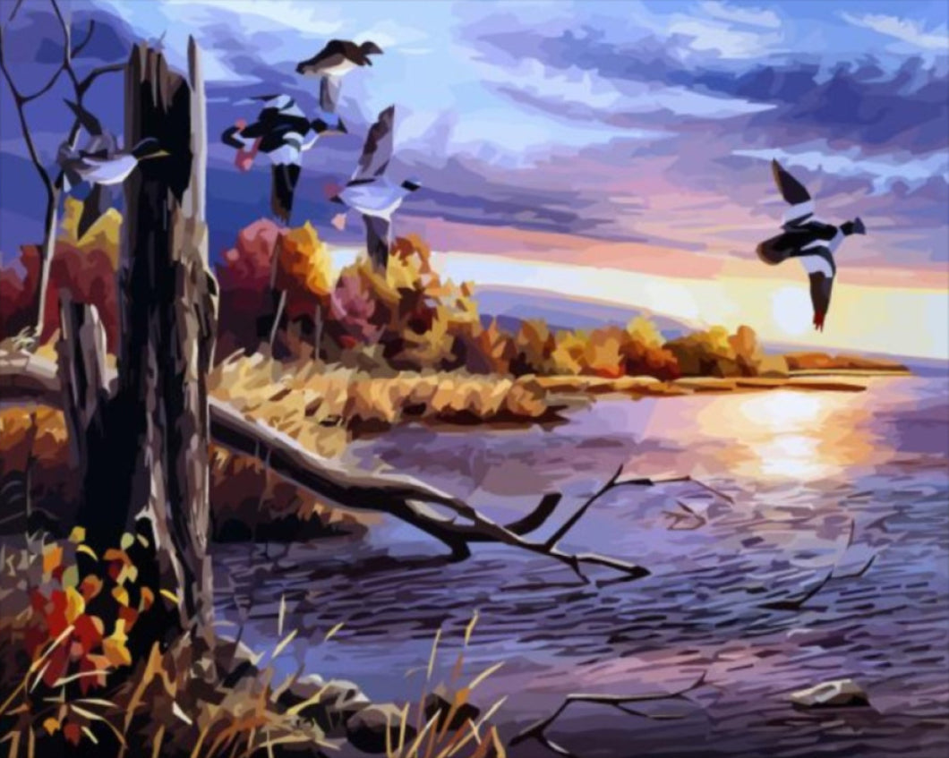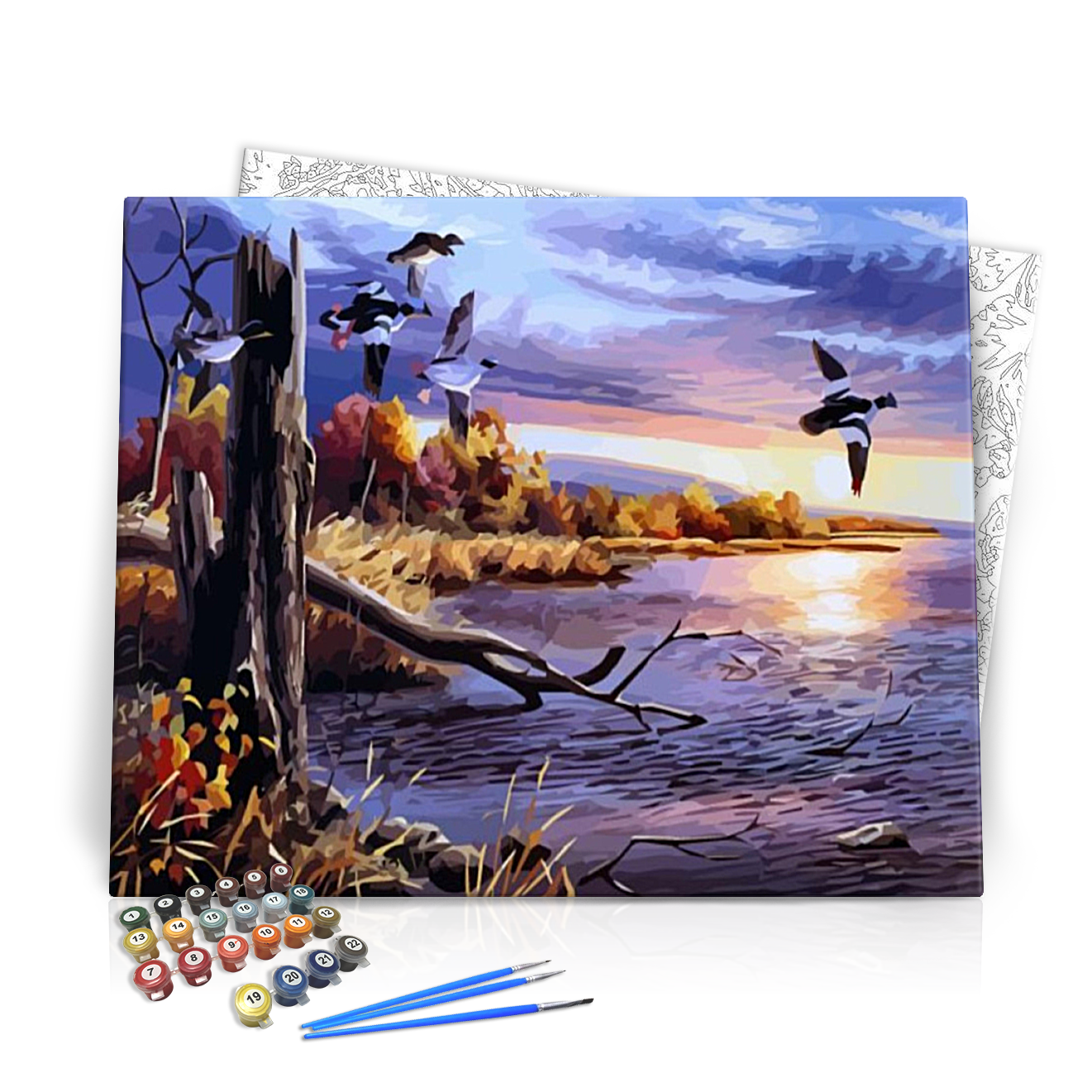 Merülj el a természet szépségeiben a Vándorlás - számfestő készlet segítségével! Ez a káprázatos festmény egy csodás naplementét ábrázol, kék és arany színek keveredésével, amely színekben gazdag környezetet teremt. A festményen élénk színekben repülő vízimadarak láthatók, amelyek dinamikusan élénkítik a tájat. A víz tükrözi a ragyogó égboltot, a háttérben pedig őszi fák pompáznak a narancs, vörös és sárga árnyalataiban, melyek az évszak varázsát idézik. Ez a műalkotás nem csupán egy festmény, hanem egy élmény, amely lehetővé teszi, hogy a természet csodáit saját kezeid által varázsolhasd a vászonra.