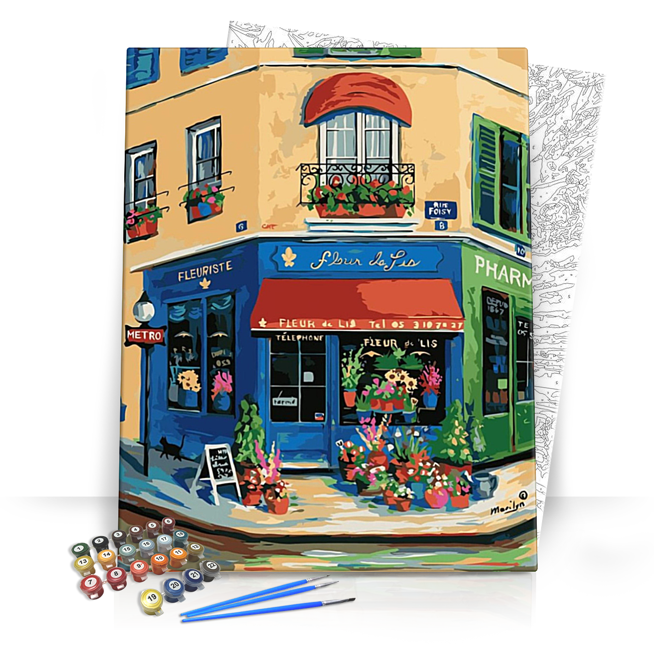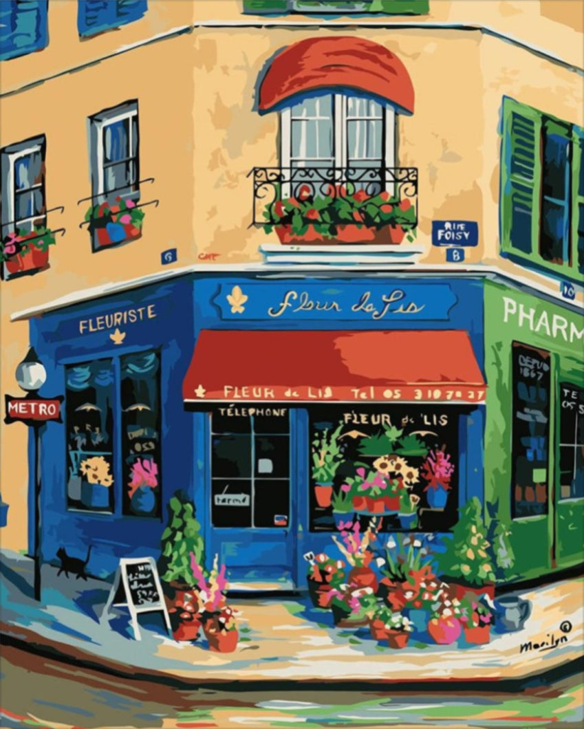 A kép, amelyet megfesthetsz, egy igazi virágüzletet ábrázol, amely tele van élettel és színekkel. A&nbps; kék és zöld árnyalatok harmonikusan keverednek, a különböző virágok színpompás látványa pedig boldogságot sugall. A boltot díszítő virágcserépben élénk pink, sárga és lila virágok bontakoznak ki, míg a piros napernyő előtt barátságos hangulatot áraszt.