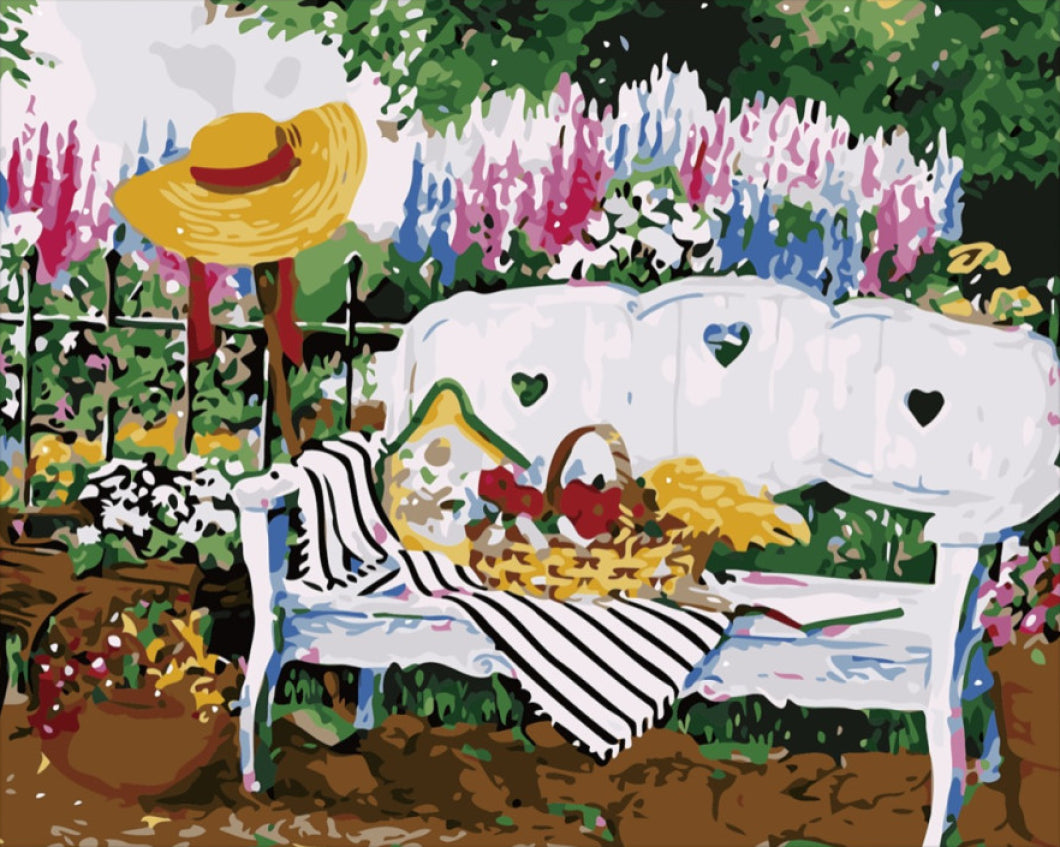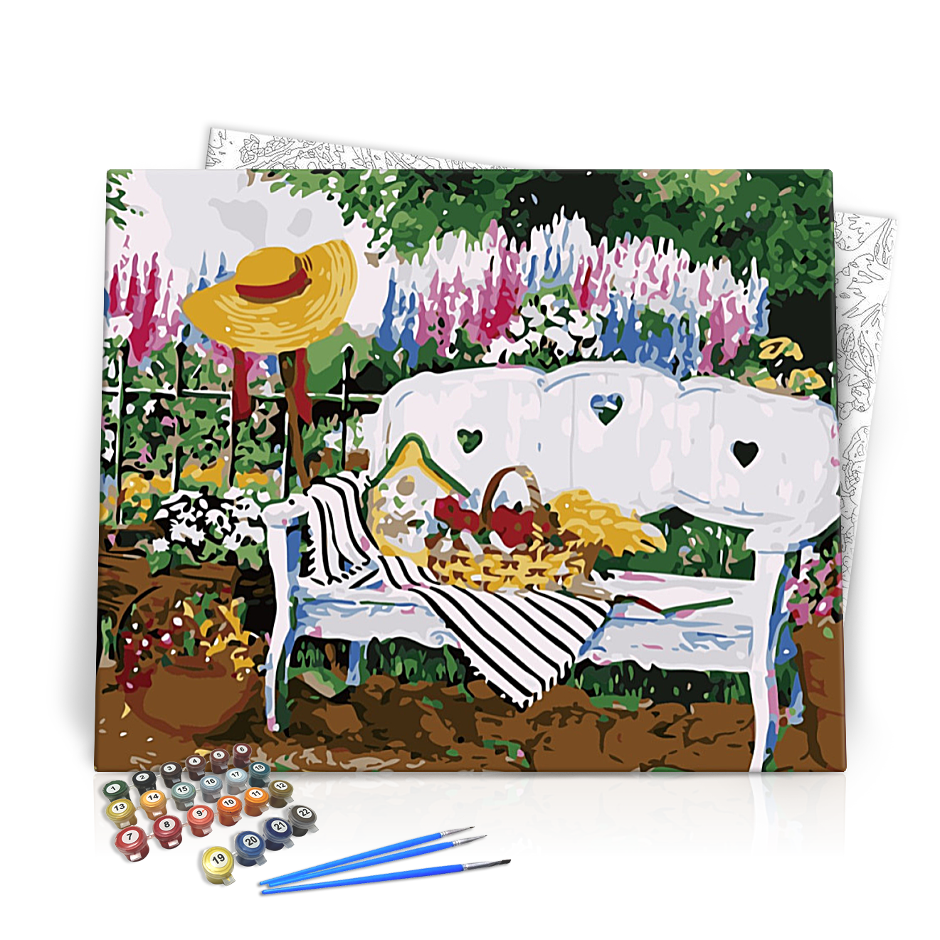 Merüljön el a festészet varázslatos világában a Virágos Piknik számfestő készlettel! Ez a lenyűgöző kép egy bájos, virágokkal körülvett kikapcsolódást idéz, ahol egy romantikus fehér padon látható egy színes piknikkosár friss gyümölcsökkel és virágokkal. A háttérben színes virágágyások és zöldellő növényzet jelenik meg, melyek élettel töltenek meg minden egyes ecsetvonást.