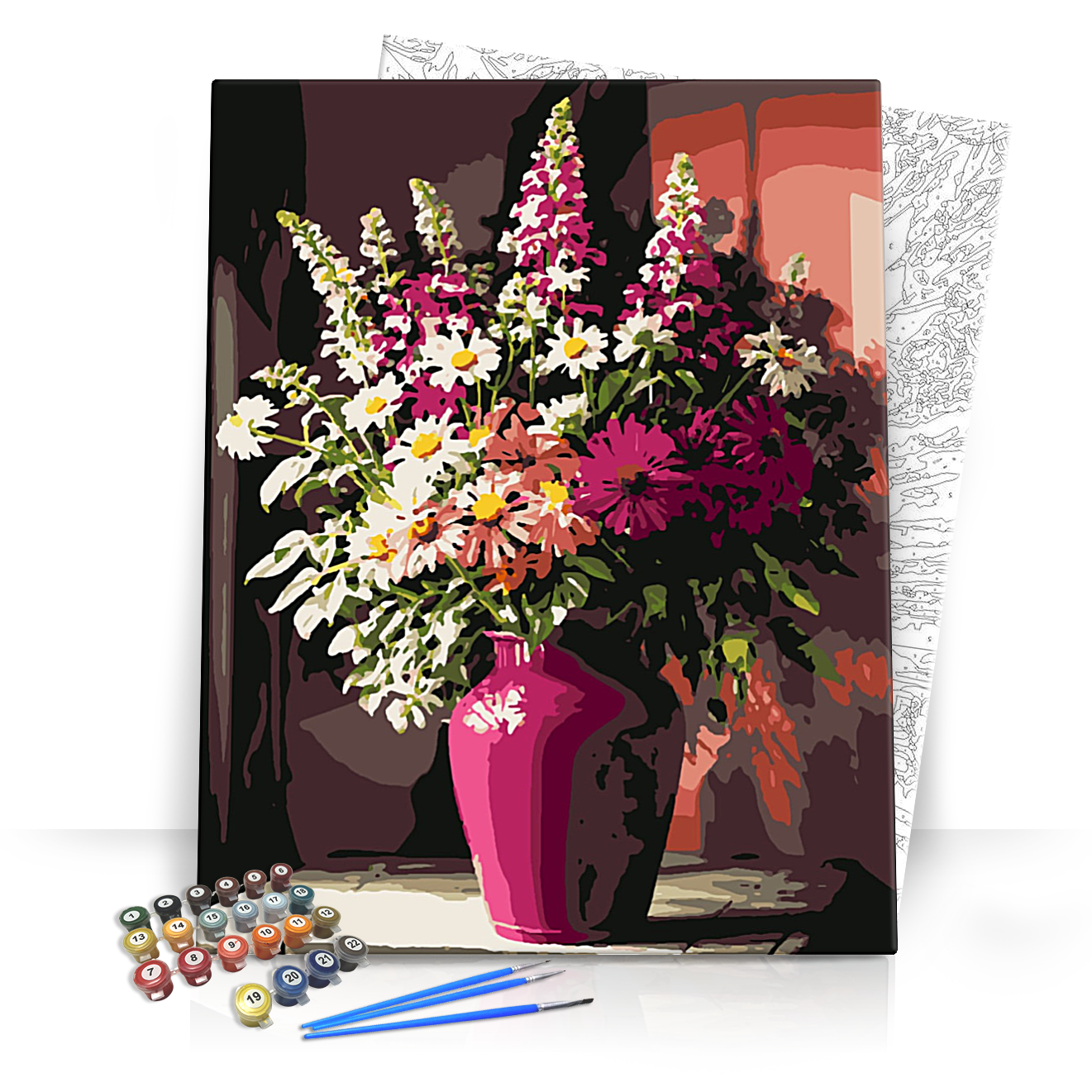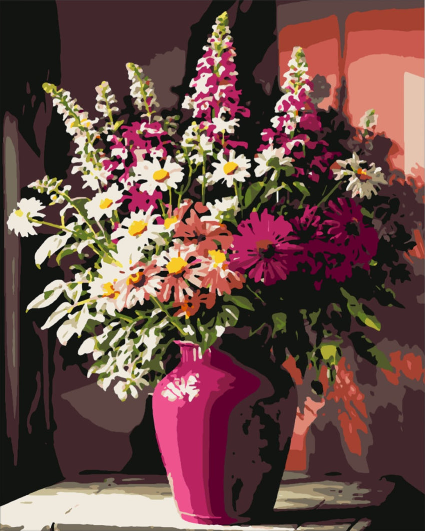 Merülj el a színek és formák varázslatos világában a Virágözön magenta vázában számfestő készlettel! Ez a lenyűgöző festmény egy gazdag színpalettájú virágkompozíciót tár elénk, ahol a gyönyörű, élénk magenta vázában színes virágok pompáznak. A sárga, fehér és rózsaszín virágok csodás összhangban díszítik otthonodat, míg a háttér elegáns sötét árnyalata kiemeli a virágok frissességét és szépségét. A kép megragadja a természet szépségét, és tökéletes dísze lehet bármely helyiségnek.
