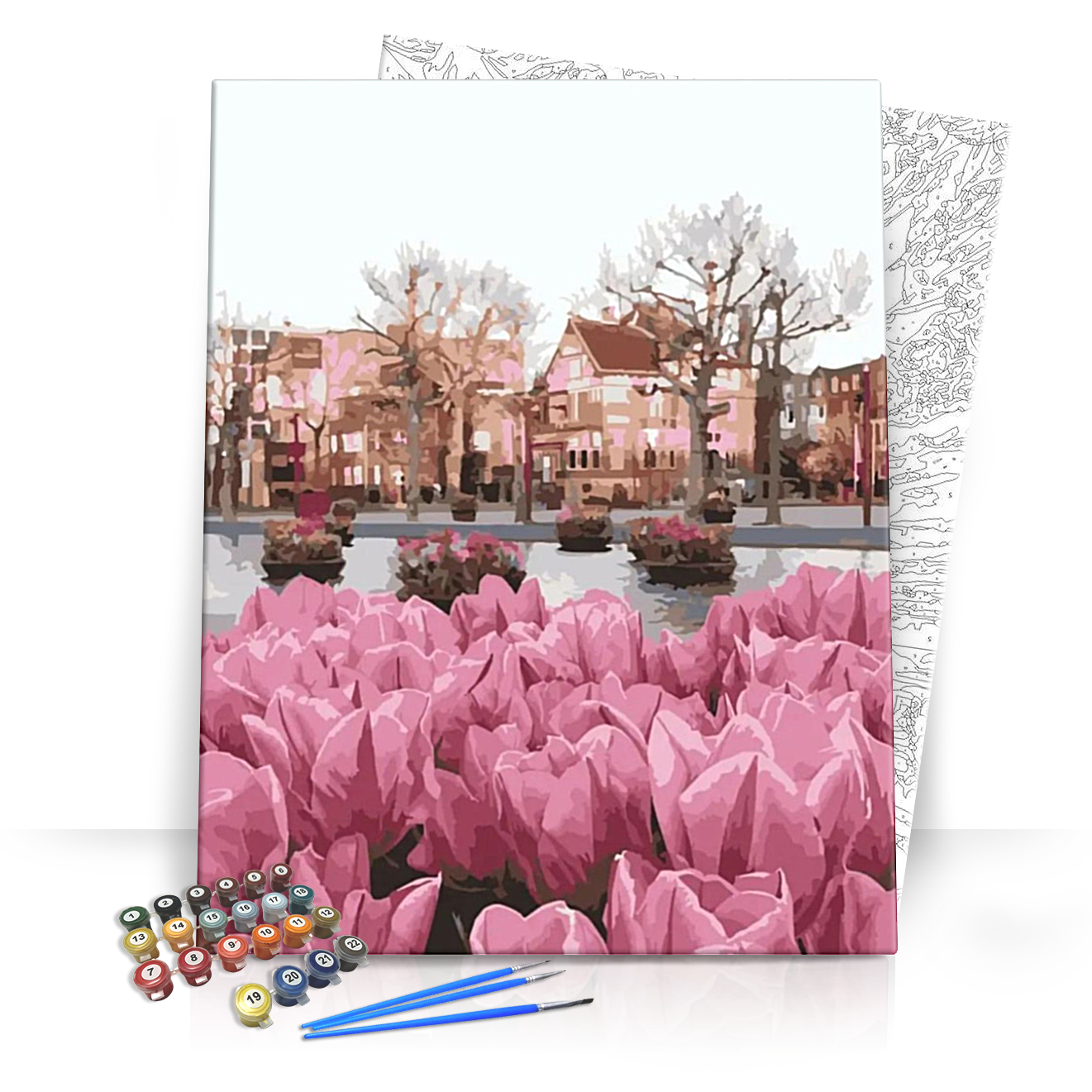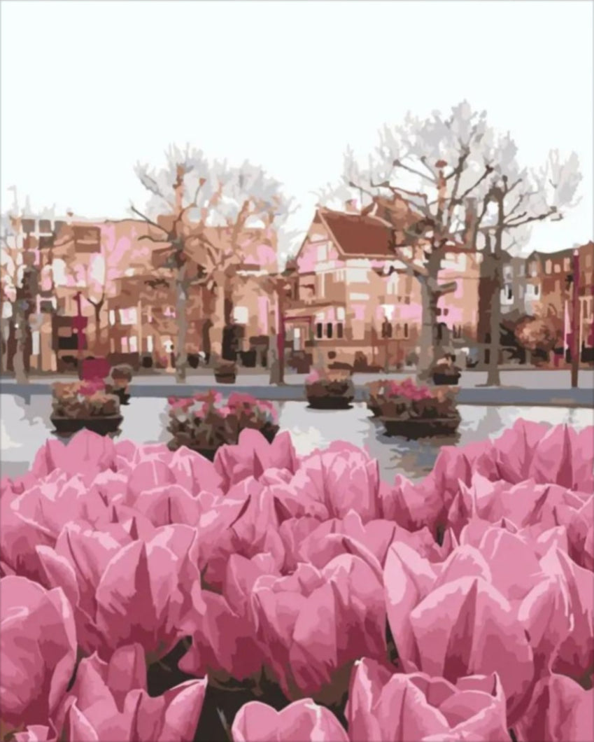 Merülj el a természet szépségében a Virágzás - számfestő készlet segítségével! Ez a lenyűgöző média megjeleníti a gyönyörű, élénk rózsaszín tulipánokat, amelyek szemet gyönyörködtető módon bontakoznak ki az elbűvölő háttér előtt. A képen a városi táj harmonikus elemei és a virágzó természet találkozása teremt meg egy varázslatos légkört, ami mindenki szívét megdobogtatja.