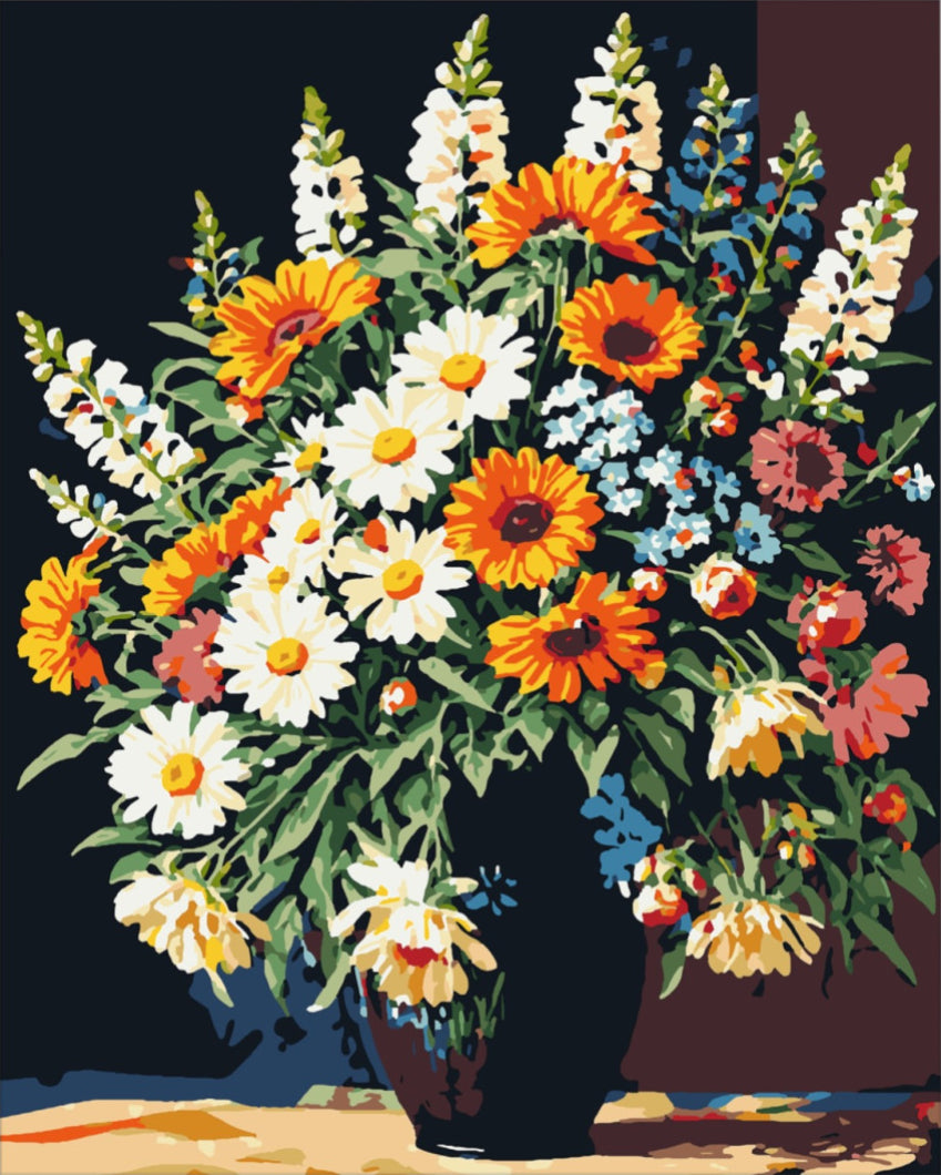A kép fő elemei közé tartozik a gazdag csokor, amely különféle virágokból áll: napraforgók, margaréták és egyéb színes virágok, mind egy fekete háttér előtt, amely kiemeli a fényeket és a textúrákat. Ez a festmény, a természet szépségét hozza el otthonodba, megteremtve a nyugodt és kellemes légkört.