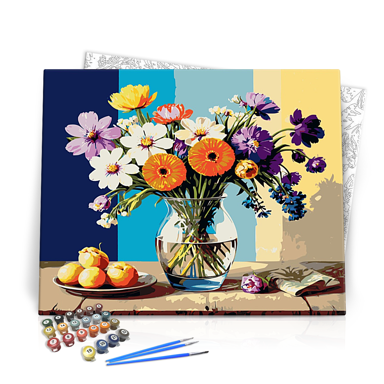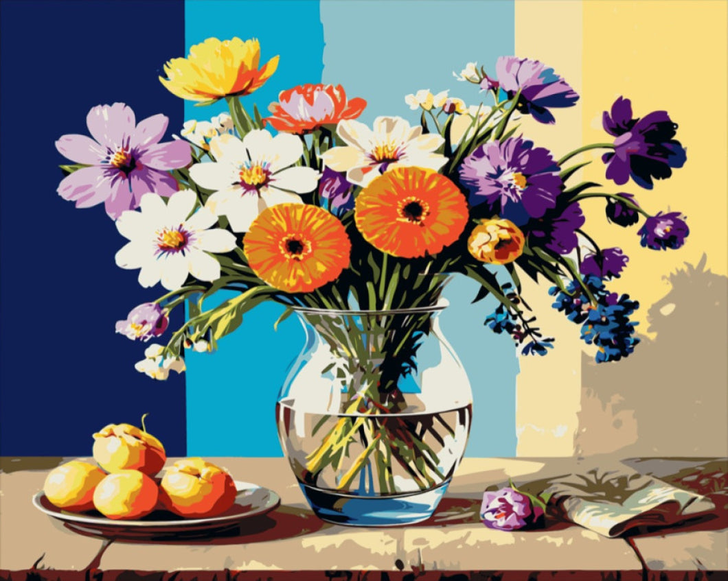 Merülj el a festészet varázsában a Vízparti virágok számfestő készlettel! Ezt a lenyűgöző kompozíciót a természet éltető szépsége ihlette, ahol a színes virágok és érett gyümölcsök harmóniájában találkozik a nyár minden vidámsága. Az élénk sárgák, lilák, rózsaszínek és narancssárgák lenyűgöző játéka teszi ezt a képet igazán különlegessé, amely egy csodás vázában áll, tükrözve a természet vibráló színeit. A hátteret képező színek egyértelműen emelik a virágok szépségét, így minden ecsetvonás élvezetes élménnyé válik.