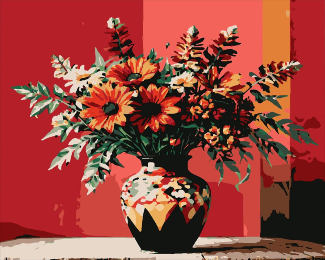 A Vörös színkavalkád elképzelése egy vibráló virágkompozíció, amelyet egy különleges, gazdagon díszített váza ölelt körül. A felhasználható színek élénk narancs, vörös és zöld árnyalatokba rendeződnek, míg a háttér tanulmányozott színkontrasztja tökéletesen kiemeli a virágok szépségét. A részletes számok és kontúrvonalak segítségével könnyedén haladhatsz a festésben, így mindenki, kezdőtől a haladó szintig, élvezheti a kézügyesség fejlődését.