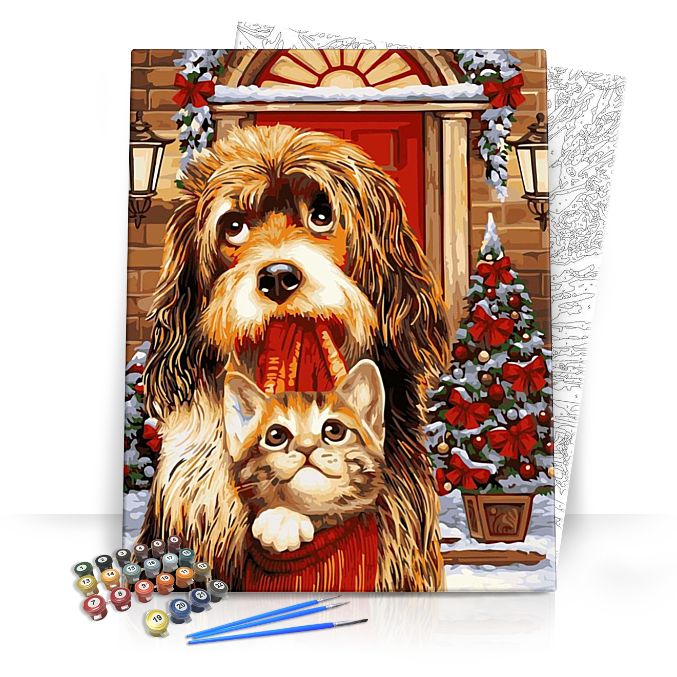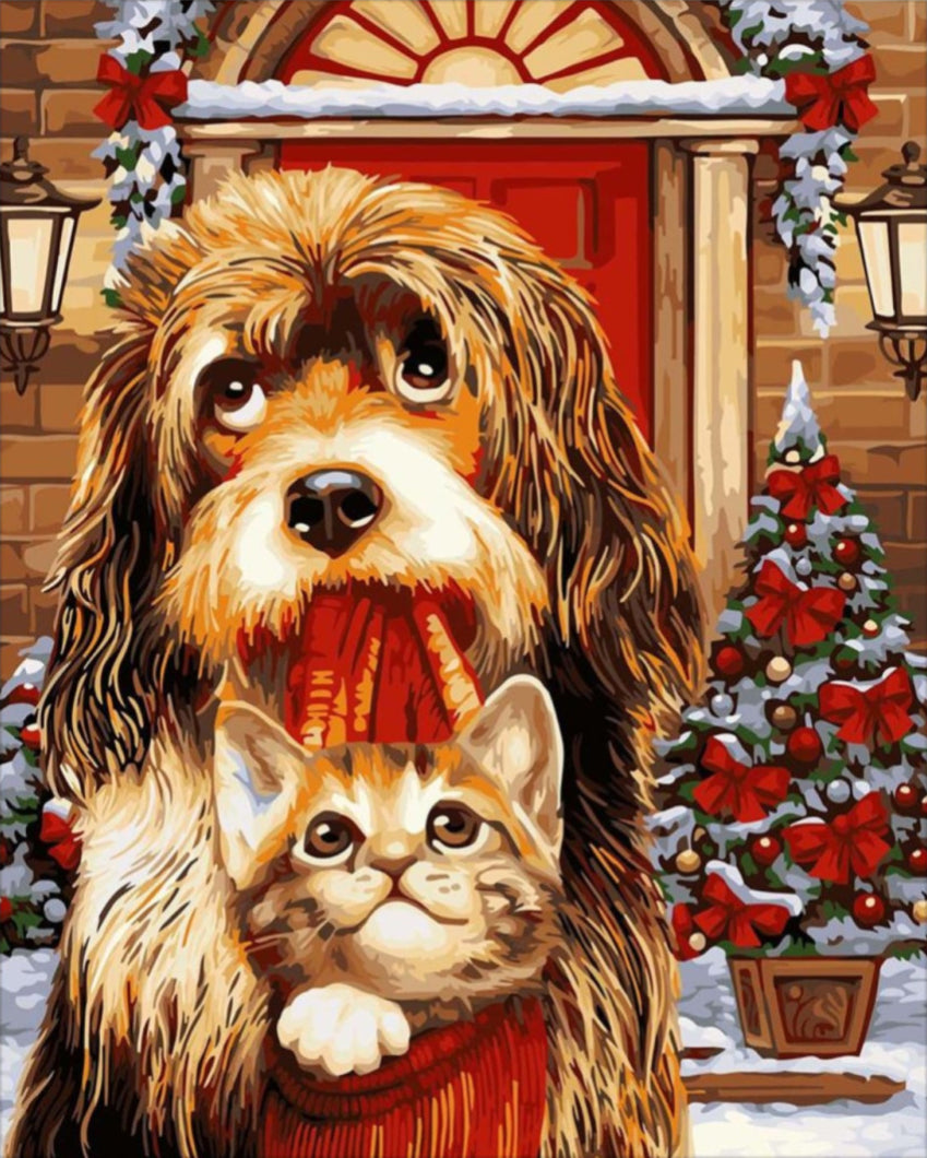 Éld át a festés örömét a Zsákba macska - számfestő készlet segítségével! Ez a gyönyörűen megkomponált kép, melyen egy aranyos kutyus és egy kiscica látható, ideális választás lehet minden állatkedvelő számára. Az ünnepi hangulatot árasztó háttérben a piros ajtó mellett karácsonyi díszek és hó borította táj fogad, amely a festés során igazi kellemes pillanatokat biztosít számodra.