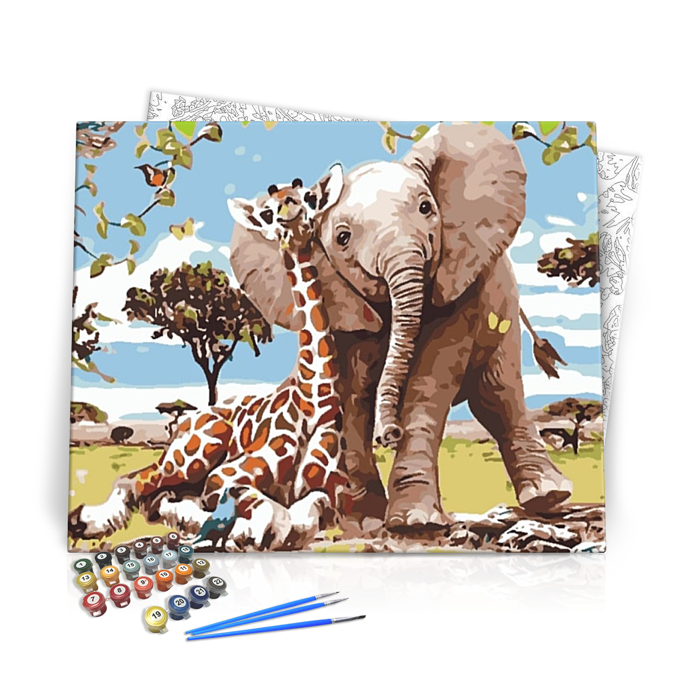Engedje szabadon kreativitását a Zsiráf és Elefánt - számfestő készlet segítségével! Ez a csodálatos festőkészlet lehetőséget ad Önnek arra, hogy egy igazi műalkotást hozzon létre, amely bemutatja a barátságos zsiráf és az aranyos elefánt találkozását egy napsütéses afrikai tájon. A festmény élénk színekben tündököl, a zsiráf jellegzetes foltjai és az elefánt barátságos arca életet visz a vászonra, így a végső mű létrehozása nemcsak szórakoztató, hanem rendkívül kielégítő élmény is.